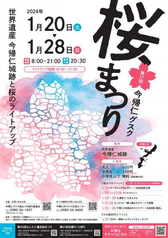 今帰仁村の桜祭りも開催中!! 2024年1/20~1/28まで こちらの特徴は今帰仁城跡まで続く道に桜が植えられています。 本部町と同じようにドライブしながら見れます。 おススメは夕方〜夜、ライトアップがあるのでとてもきれいですよ。